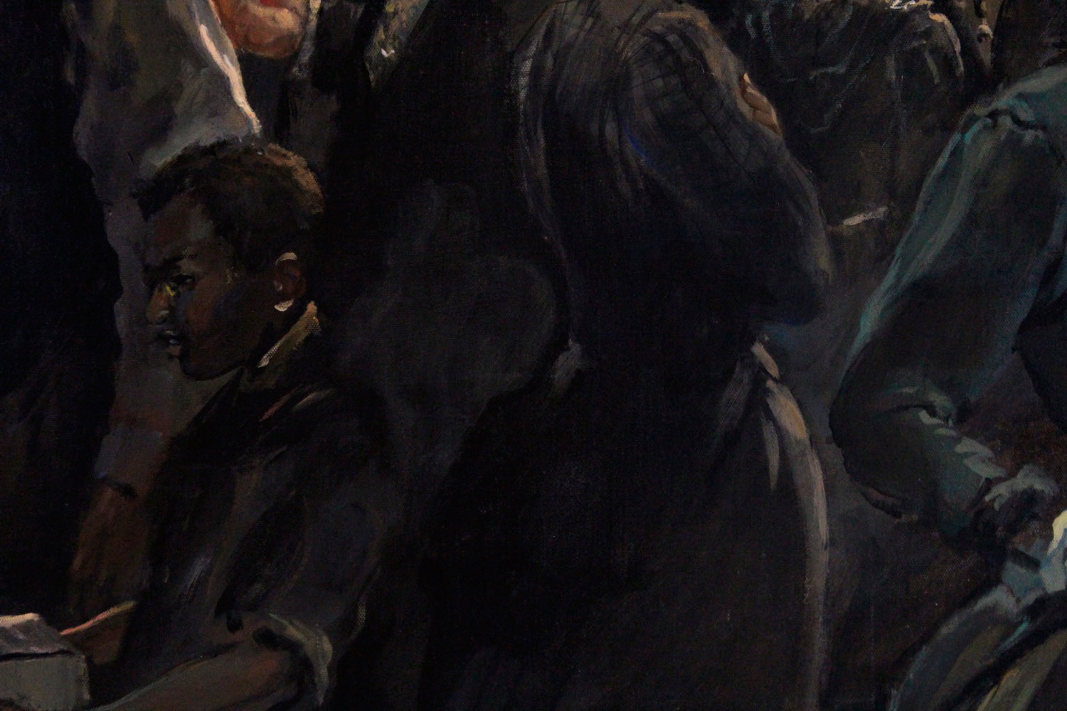 This section, the dark wharf overshadowed by the bows and rigging of many ships, I painted dark first and pulled the figures from the dark with muted midtones and a few punched highlights.